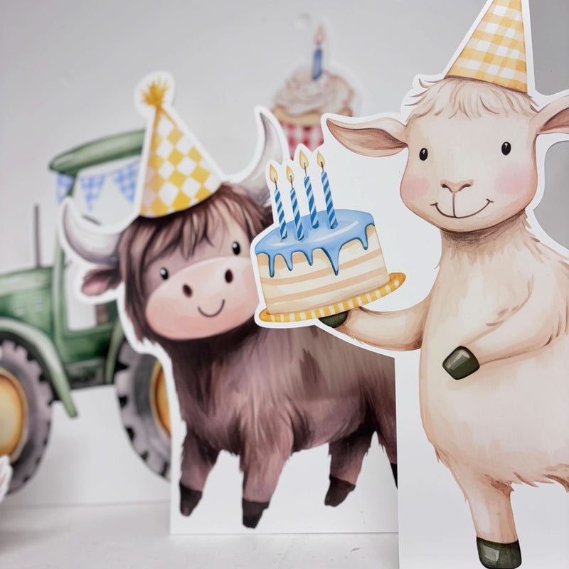 Mini Barnyard Birthday Bundle featuring personalised waterproof foamex cutouts including highland cow, goat, tractor, and birthday cake with party hats